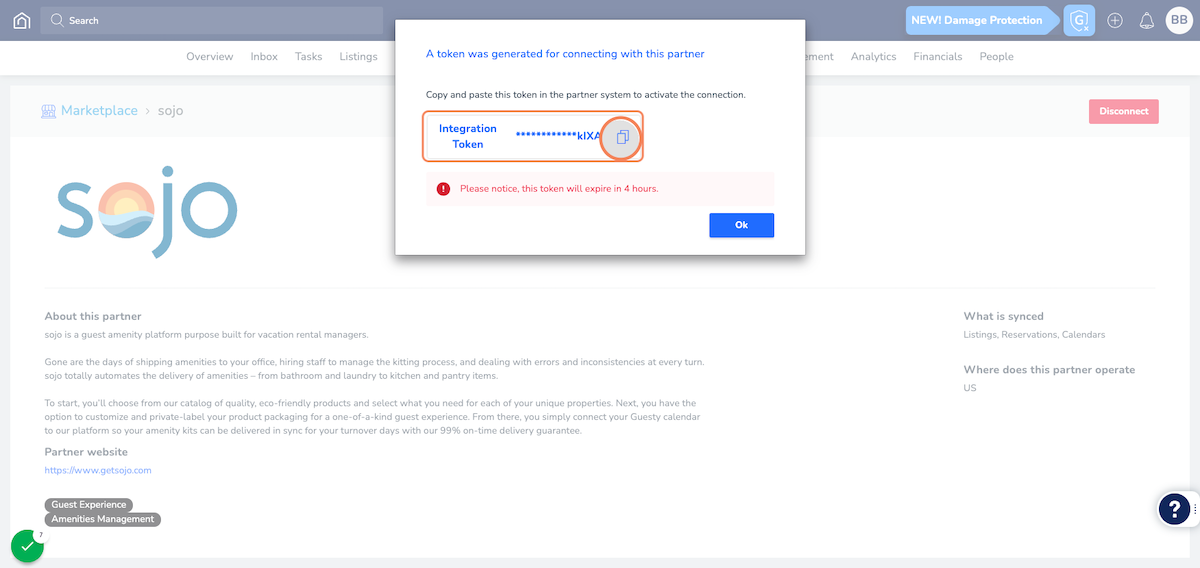 - Copy the Integration Token by clicking on the icon in the orange circle below. Send the integration token to your sojo account manager or support@getsojo.com ASAP - it expires in 4 hours! So please prioritize this to submit within the timeframe.