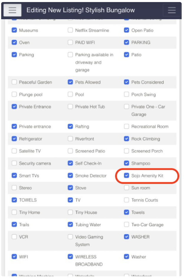 - Add the amenity 'Sojo Amenity Kit' EXACTLY like it is typed here to all properties (or areas) that you want sojo to provide kits