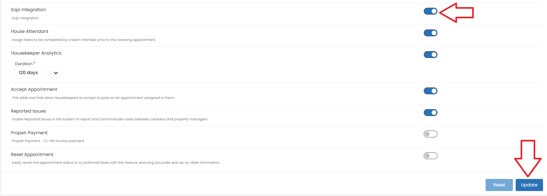 2. Toggle on Sojo Integration and select the Blue Update button at the bottom right. Once enabled then they will be able to go to Setup, Integrations, and Sojo beginning at step 1 of your article.