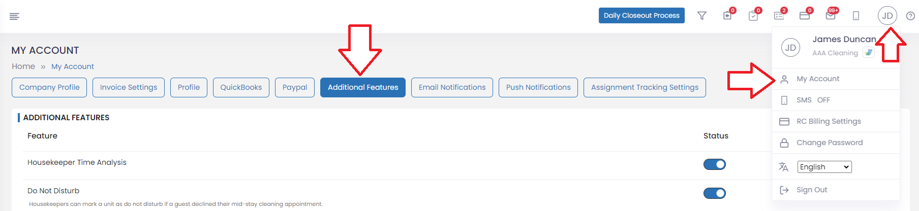 1. The Admin of your ResortCleaning account will go to My Account at the top right and then select Additional Features.
