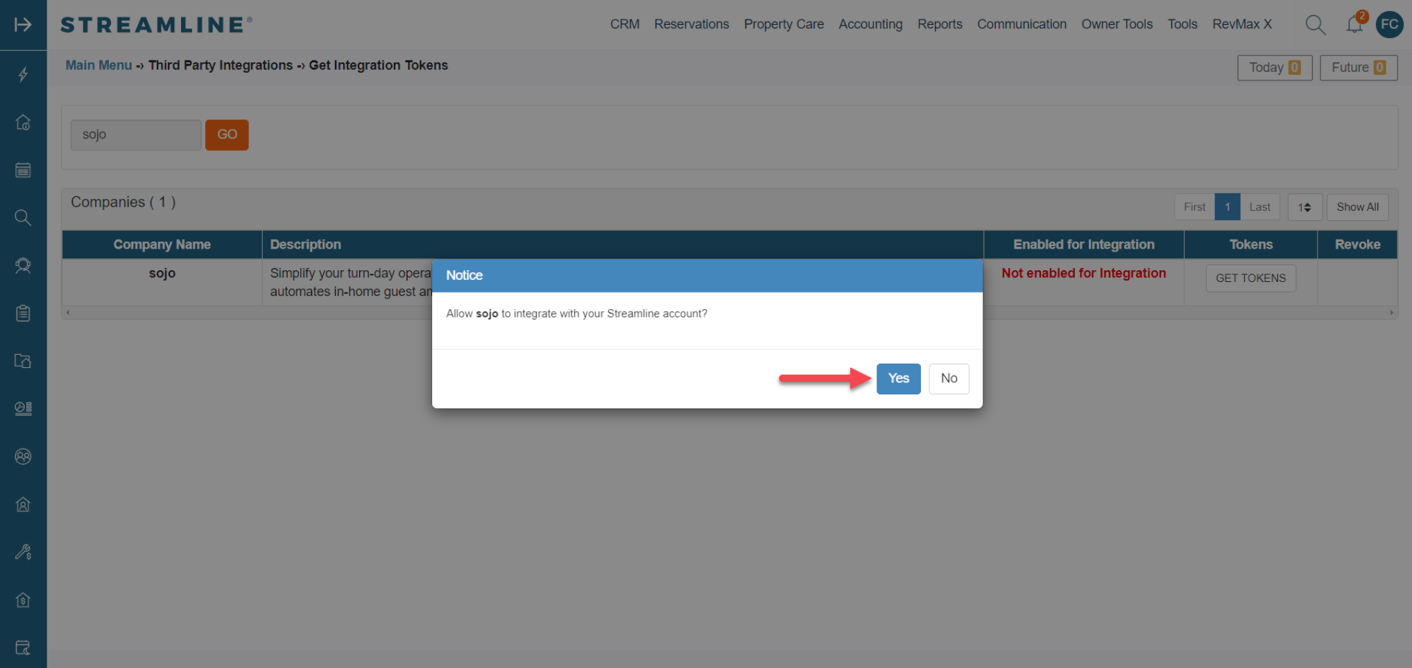- Select Yes to allow sojo to integrate with your Streamline account.