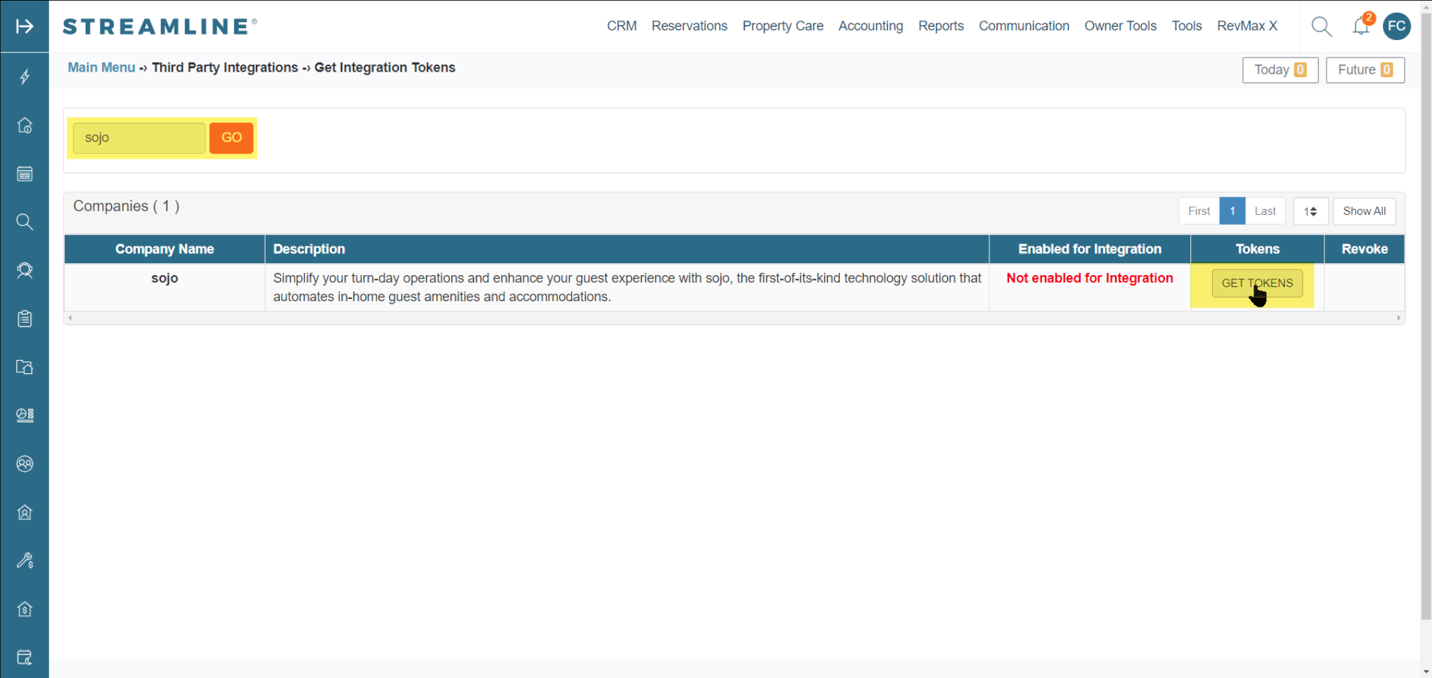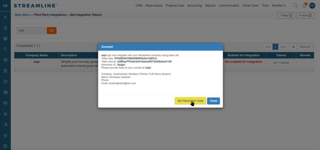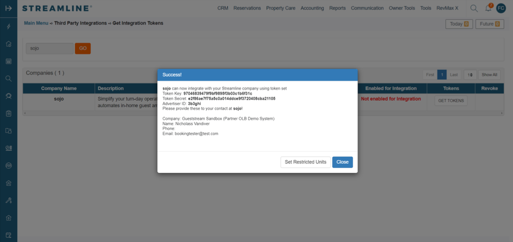 - Success! sojo can now integrate with your Streamline system using the generated token set (these token are automatically sent to our team, so you don't need to send them manually)