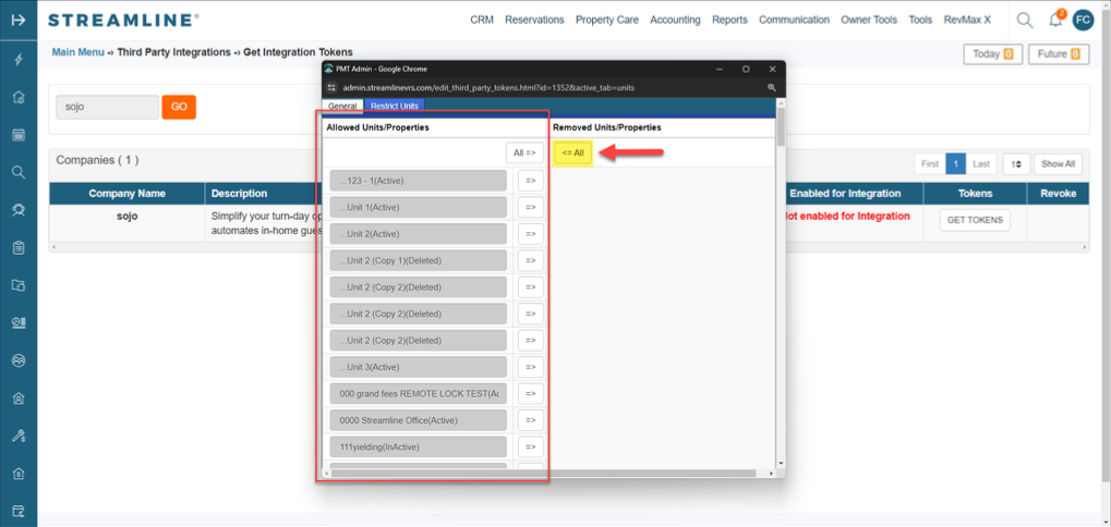 - From here, you'll want to define what units will be available for sojo through the API. Click on Set Restricted Units.